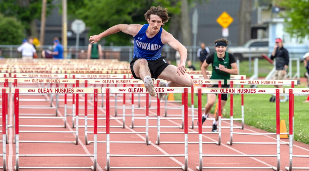 OBSERVER Photo by Tim Frank Gowanda's Maddox Hudson runs the 110-meter hurdles as part of the CCAA pentathlon Saturday at Olean High School.