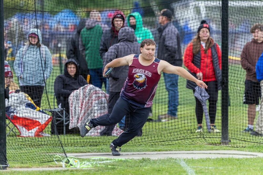 The Chautauqua Lake/Westfield/Brocton track and field team claimed a pair of events on the first day of the Chautauqua-Cattaraugus Athletic Association Championships at Bill Race Field on Friday. Jada Cole won the girls high jump and Walter Lukasiak, pictured, claimed the boys discus for the Eagles. OBSERVER Photo by Tim Frank
