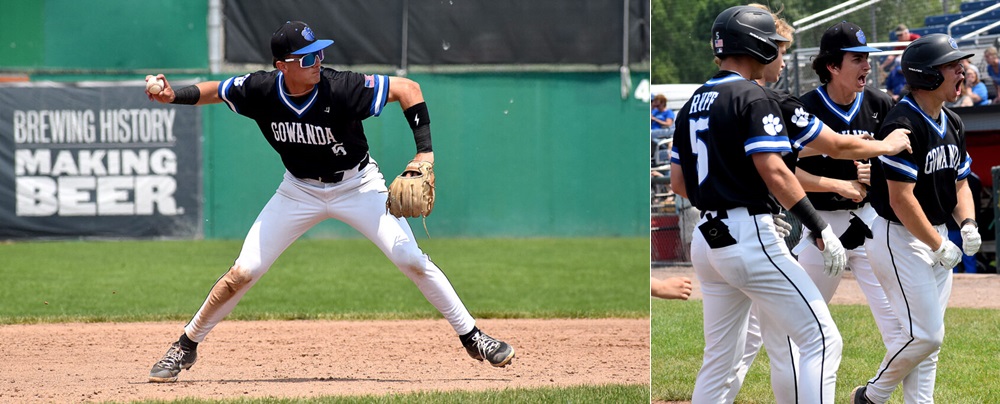 OBSERVER Photos by Matt Spielman Above, left, Gowanda third baseman Logan Ruff throws across the infield during Saturday's Class C Far West Regional against Kendall at Dwyer Stadium in Batavia. Above, right, Gowanda's Blake Herman yells toward the crowd while celebrating with teammates Logan Ruff (5), Landen Ashley and Seth Geiger during the third inning of Saturday's Class C Far West Regional against Kendall at Dwyer Stadium in Batavia.