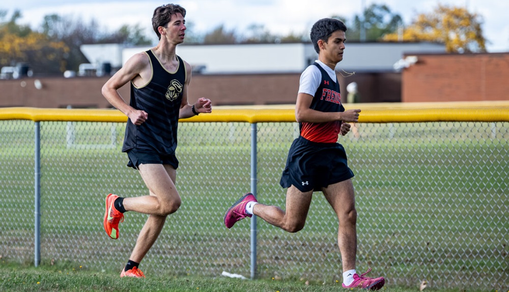 Silver Creek/Dunkirk/Forestville senior Sam Bowers trails Fredonia's Pietro Cabitza in nonleague cross country action on Monday in Silver Creek. OBSERVER Photo by Jon Neubauer