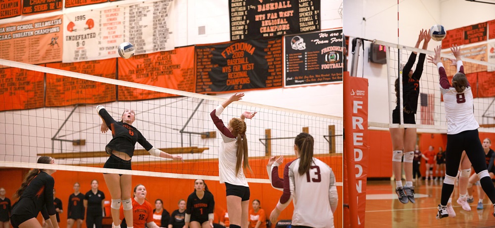 Above, OBSERVER Photos by Ashleigh Brown. At left, Fredonia's Londyn Wilmot rises up for a spike during Thursday's Section VI Class B1 quarterfinal match against Tonawanda at Fredonia High School. At right, the Hillbillies' Elyse Bugaj rises up for a block.
