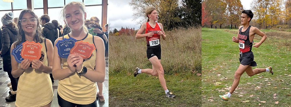 Above, left, Silver Creek/Dunkirk/Forestville's Hanan Mohamad Narvaez, left, and Leah Mays hold their patches after qualifying for the state cross country championships Friday at Elma Meadows Golf Course. [Submitted Photo]. Above, center, Fredonia/Westfield's Izzie Czekanski competes at the Section VI championships at Elma Meadows Golf Course on Friday. Above, right, Fredonia/Westfield's Pietro Cabitza competes at the Section VI championships at Elma Meadows Golf Course on Friday.
