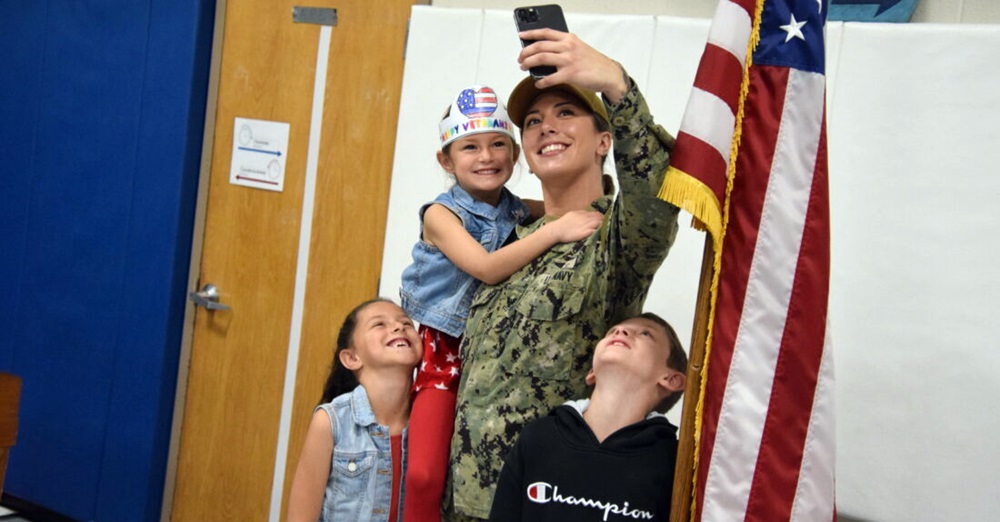 Students and staff - many dressed in red, white and blue - united in the gym in a show of patriotism to recognize military veterans ahead of the federal holiday on Tuesday.