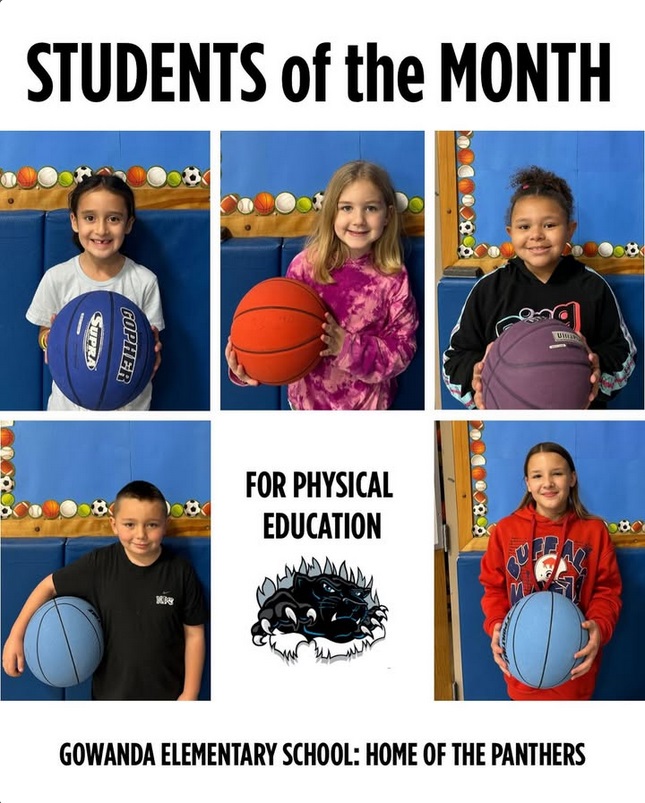 Gowanda Elementary School's October 2025 Students of the Month for Physical Education are, from top clockwise, kindergartner Lucille Gill, first-gradre Sabrina Fulford, second-grader Mia McBride, third-grader Parker McKeever, and fourth-grader Charlee Pagan. These young Panthers work hard every day, are kind, and have a great attitude towards themselves, teachers and classmates.