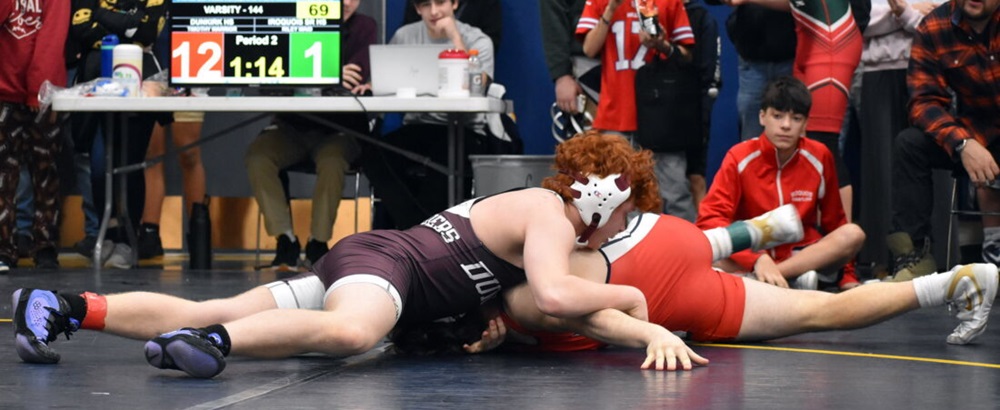 OBSERVER Photo by Christian Storms Dunkirk's Timothy Warrior works Riley Maid of Iroquois to a pin in 144-pound bracket at the Patrick J. Morales Memorial wrestling tournament on Friday in Falconer.