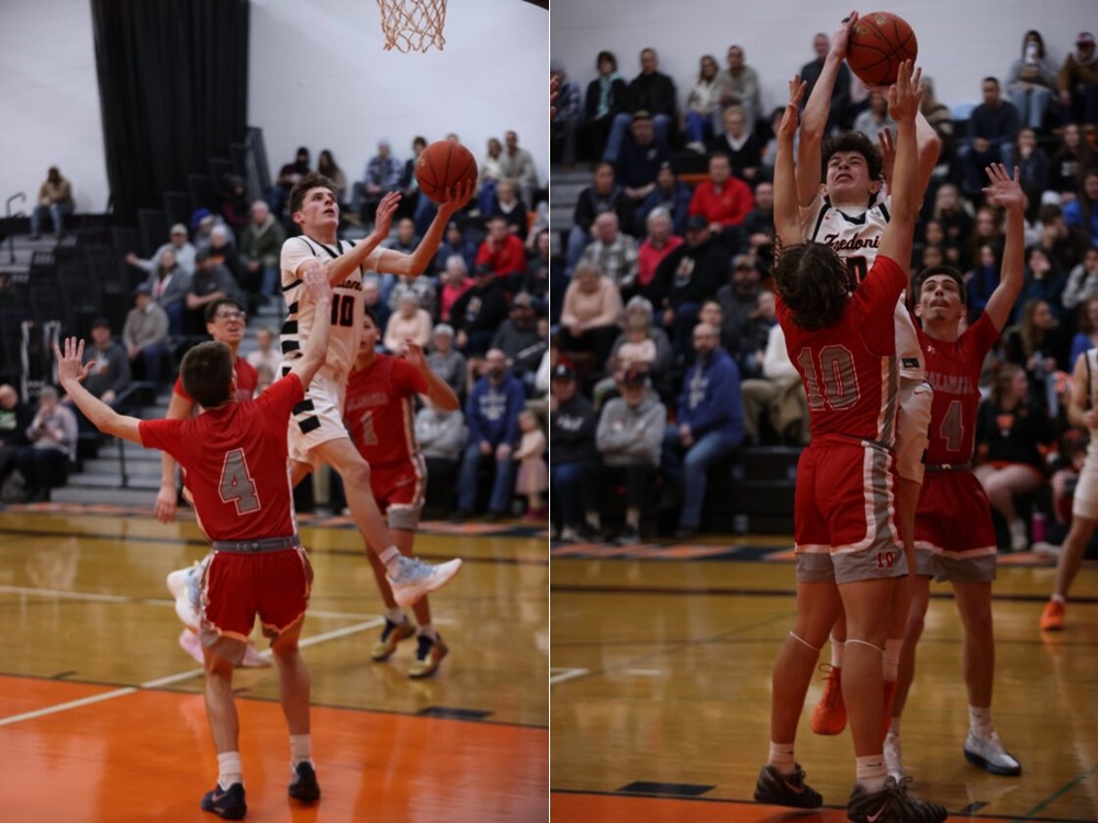 OBSERVER Photos by Ashleigh Brown Above, left, Fredonia's RJ Koopman lays up a shot ahead of Salamanca's Dominick Hill during CCAA Division 1 boys basketball action in Fredonia on Friday night. Above, right, Fredonia's Colin Luce goes up for a shot while being guarded by Salamanca's Brendon Ghani during CCAA Division 1 boys basketball action Friday.
