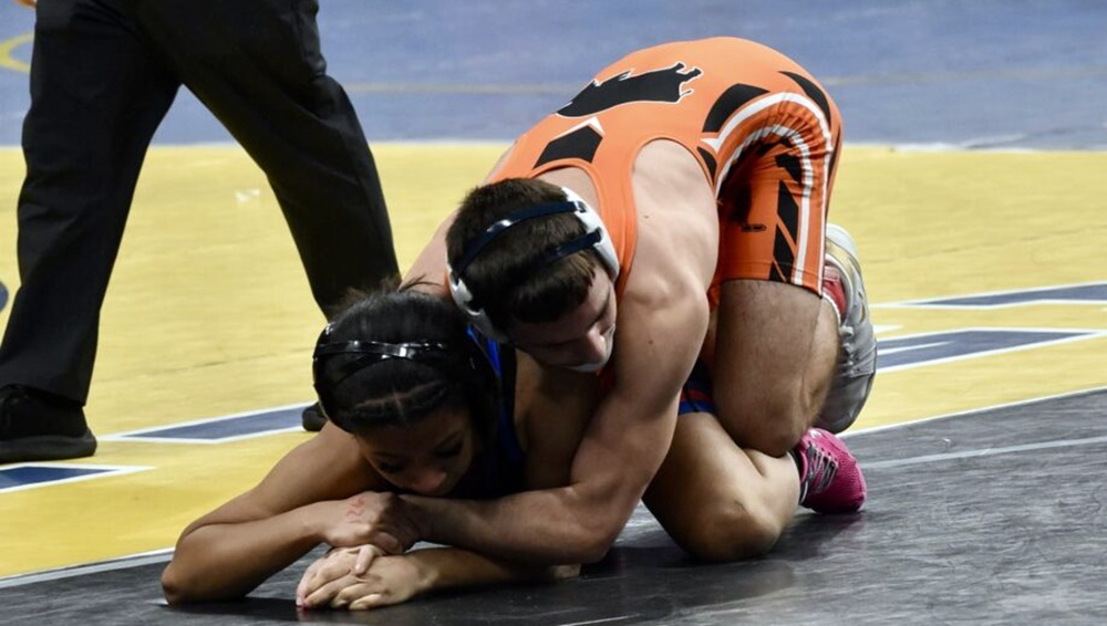 Gowanda/Pine Valley's Nathan Warrior controls his opening match at 144 pounds in the Division 2 bracket of the NYSPHSAA wrestling championships at MVP Arena in Albany on Friday morning. Warrior won his match against Diego Villacis of North Shore-VIII with a pin at 2:26. OBSERVER photo by Christian Storms