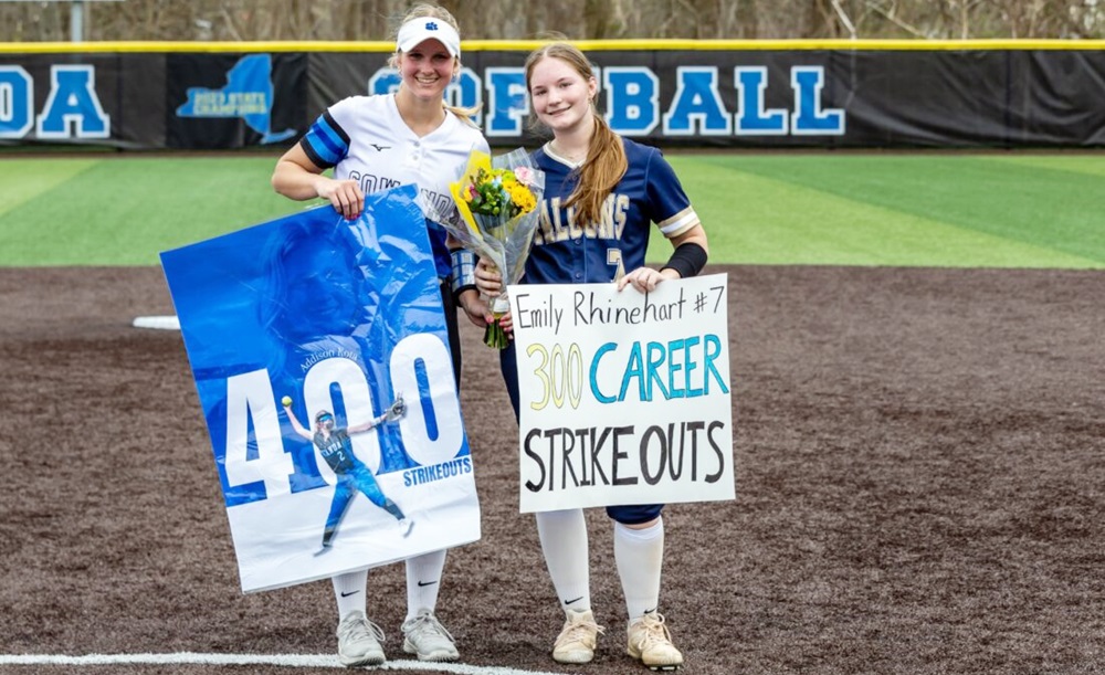 Submitted Photo Gowanda's Addison Kota, left, and Falconer's Emily Rhinehart celebrate their career strikeout milestones after Saturday's nonleague softball game at Gowanda High School.